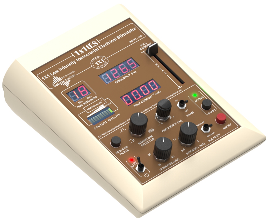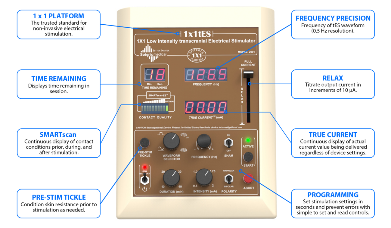 El dispositivo de estimulación eléctrica transcraneal 1×1 (1×1-tES) de Soterix Medical es el estimulador más sofisticado y preciso jamás diseñado para tDCS, tACS, tPCS y tRNS ondas conresolución a 0.5 Hz adicionada al tDCS. El 1×1 tES representa una década de diseño biomédico e industrial para crear un dispositivo que combina una flexibilidad, confiabilidad y facilidad de uso inigualables a través de características únicas de Soterix Medical y la interfaz Open-Panel™.